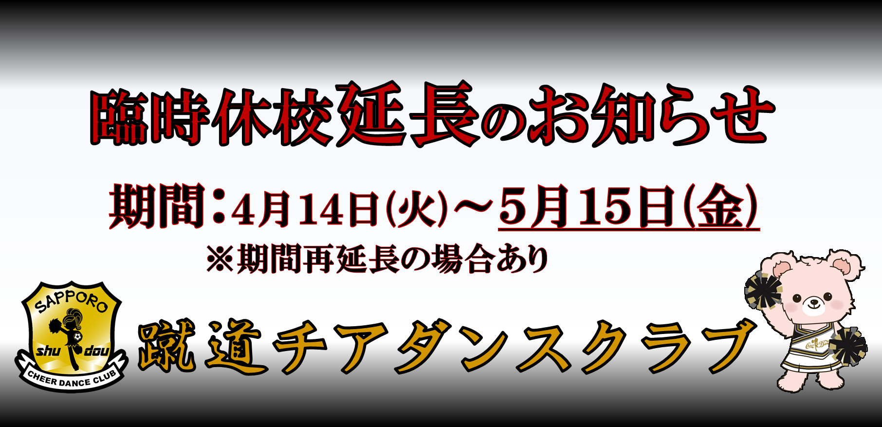 新型コロナウイルス感染拡大による、緊急事態宣言が延長されたこと受け、蹴道チアダンスクラブでは、下記の期間を臨時休校を延長することとなりました。