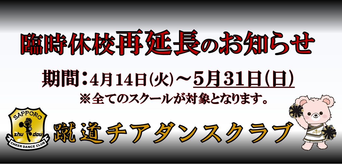 新型コロナウイルス感染拡大による、緊急事態宣言が延長されたこと受け、蹴道チアダンスクラブでは、下記の期間を臨時休校を延長することとなりました。