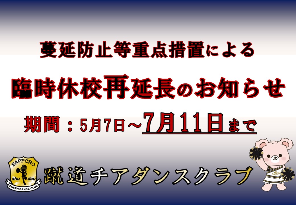 北海道地域の緊急事態宣言が解除されましたが、引き続き蔓延防止等重点措置が札幌市で発令されましたことを受け、期間中(6月21日~7月11日)札幌市内の公共施設も全て休館となり、蹴道チアダンスクラブでは下記の期間、臨時休校することとなりました。